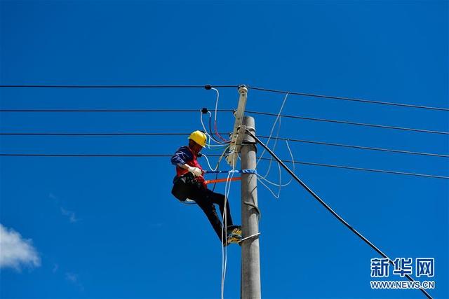 在青海省果洛藏族自治州玛多县玛查理镇噶丹村,国网玛多县供电公司工作人员在检查电网(8月19日摄)。 新华社记者 张龙 摄