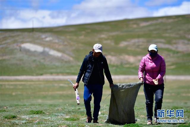 在青海省果洛藏族自治州玛多县玛查理镇噶丹村,生态管护员索南吉(右)与才让多杰在村子周边的草原上捡垃圾(8月19日摄)。 新华社记者 张龙 摄