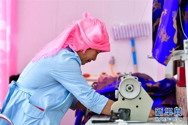 在青海省海南藏族自治州共和县廿地乡切扎村,村民尕么吉在缝制藏装(8月17日摄)。 新华社记者 张龙 摄