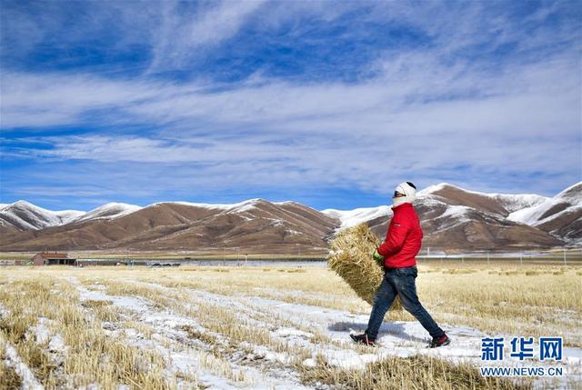 在青海省果洛藏族自治州玛沁县大武乡格多村,治理后的黑土滩长出牧草,当地牧民加央收割搬运牧草(2019年11月8日摄)。 新华社记者 张龙 摄