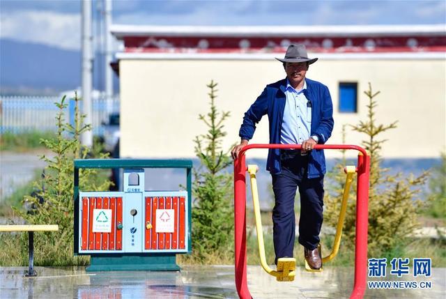 在青海省海南藏族自治州共和县廿地乡切扎村,村民在村里休闲健身(8月17日摄)。 新华社记者 张龙 摄