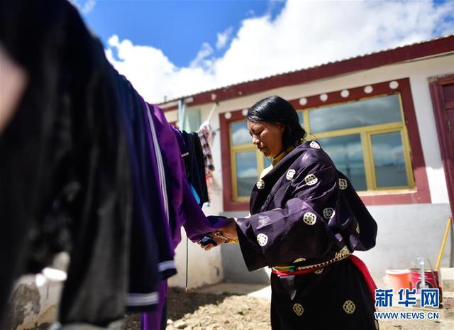 在青海省果洛藏族自治州玛多县玛查理镇噶丹村,村民德吉在新建的院子里晾晒衣服(8月19日摄)。 新华社记者 张龙 摄