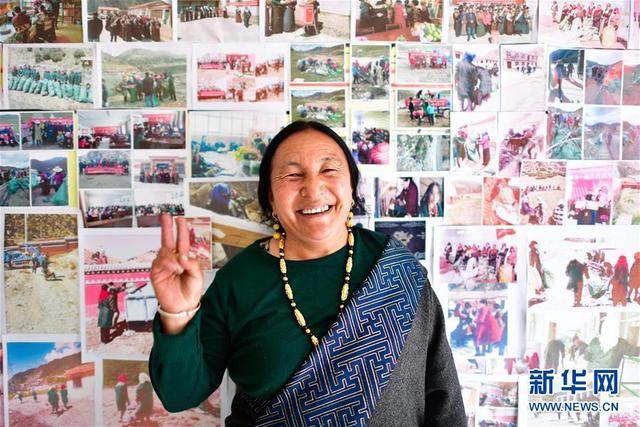 在青海省果洛藏族自治州玛沁县雪山乡阴柯河村,当地牧民关却卓玛在阴柯河牧委会日赛牧女环保小组活动照片墙前留影(8月20日摄)。 新华社记者 张龙 摄