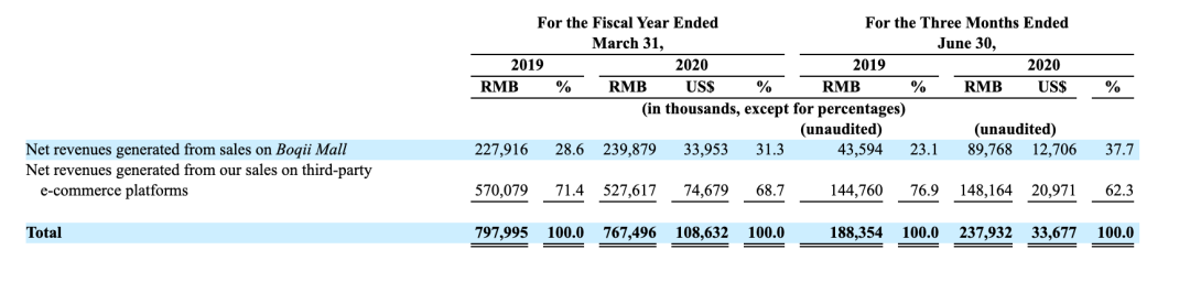 波奇网的产品销售主要依赖于第三方电商平台。2019财年至2020财年,波奇商城产生的产品销售净收入占比分别为28.6%、31.3%,第三方电商平台的产品销售净收入占比分别为71.4%、68.7%。