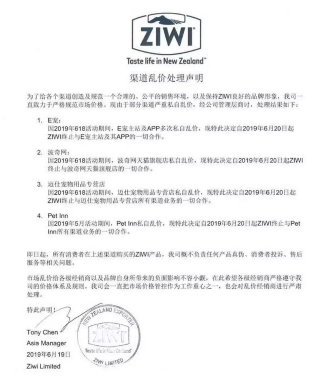 除自有品牌有被投诉的“历史”外,波奇网与合作品牌伙伴也曾发生矛盾。此前在2019年6月20日,新西兰宠物食品企业ZIWI溢益巅峰(以下简称“巅峰”)在其官网发布《渠道乱价处理声明》,称因部分合作渠道商“私自乱价”,于6月20日起停止与部分渠道商合作。《声明》中包括波奇网天猫旗舰店在内的4家渠道商。