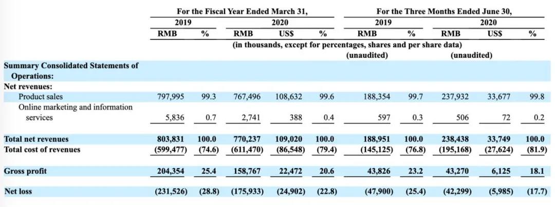 据招股书,2019-2020财年,波奇网营收分别为8.04亿元、7.70亿元,2020财年营收同比下降4.23%;2021财年首财季(2020年4月至6月)营收为2.38亿元,较2020财年同期增长26.19%。