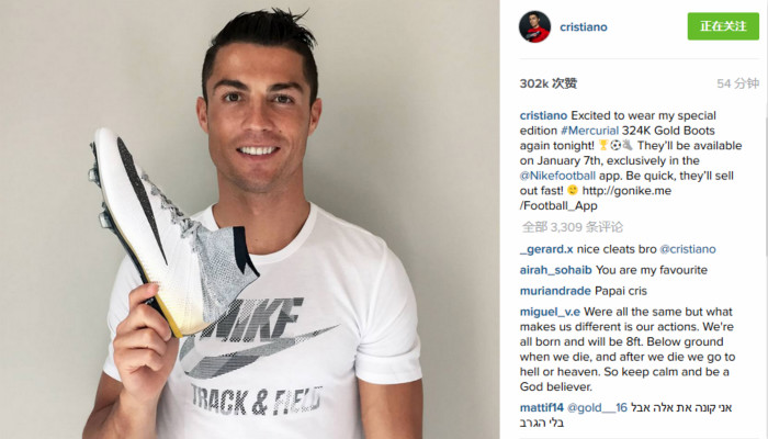 在北京时间1月4日凌晨皇家马德里客场挑战瓦伦西亚的比赛之前,C罗在他的Instagram上晒出了耐克为他特制的一双324K纯金刺客球鞋。这款球鞋最先是耐克在去年10月份为了纪念C罗以324球成为皇马第一射手而推出的。而C罗也在比赛中穿上了这款球鞋,可惜,新球鞋没能给皇马带来一场胜利,他们最终2-2与瓦伦西亚握手言和。