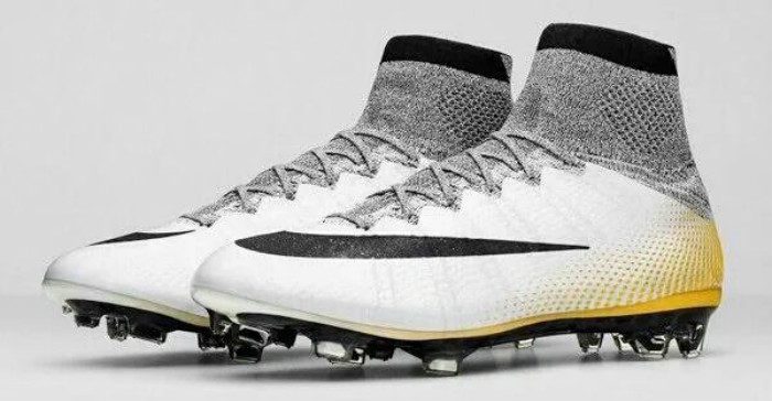 将黄金元素运用在球鞋上并不是一个全新的想法。在今年年初,C罗获得了他个人第三座金球奖后,耐克也适时地为他推出了一款纪念版刺客球鞋。和上面这款白色为主的球鞋不同,当时推出的那款球鞋以黑色为主,但在鞋子的前端运用了大块的金色。而在鞋子内侧的“CR7”标志上,则通过手工方式镶满了装饰用的碎钻。相比于新近推出的黄金球鞋,去年年初推出的这款鞋子更显奢华。