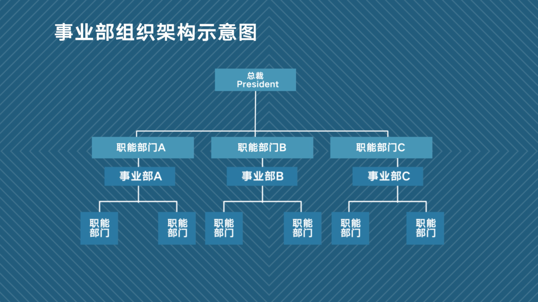 在总公司下,按照产品、地区、市场等,我们划分出各个事业部。每个事业又有自己的产品和特定市场,能够完成产品从生产到销售的全部职能。各事业部还有个特点,就是在财务上要独立核算、自负盈亏。
