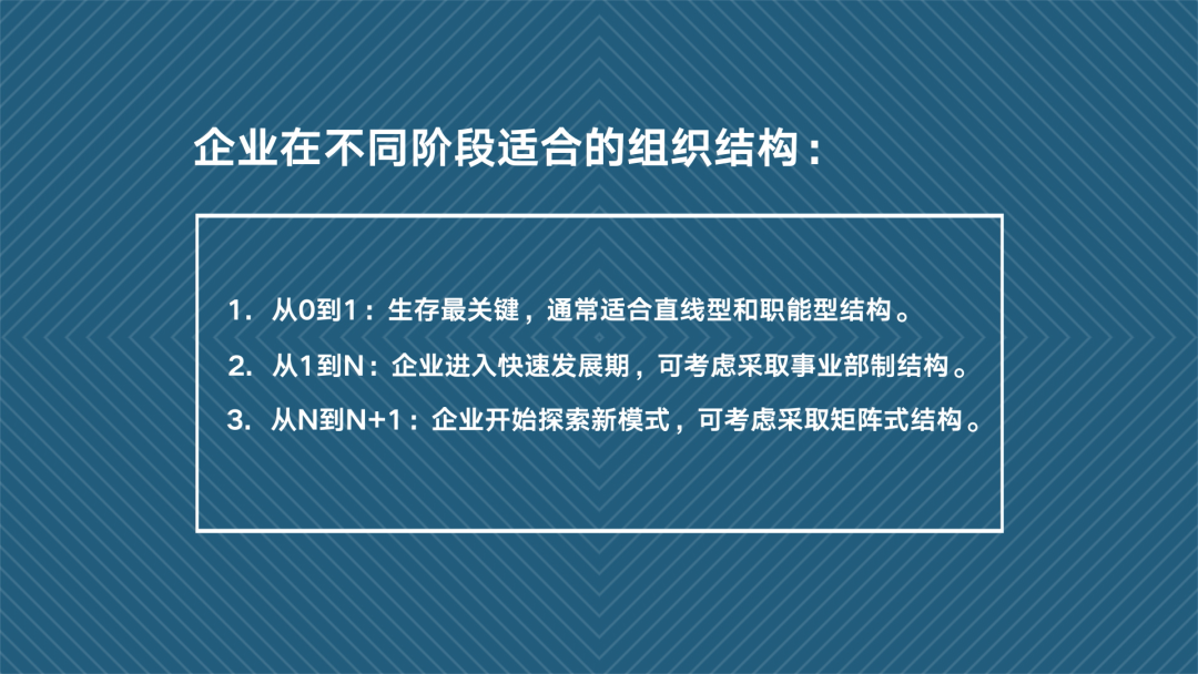 第一个阶段就是从0到1,这个时候,最适应的我们的是直线和职能型结构。