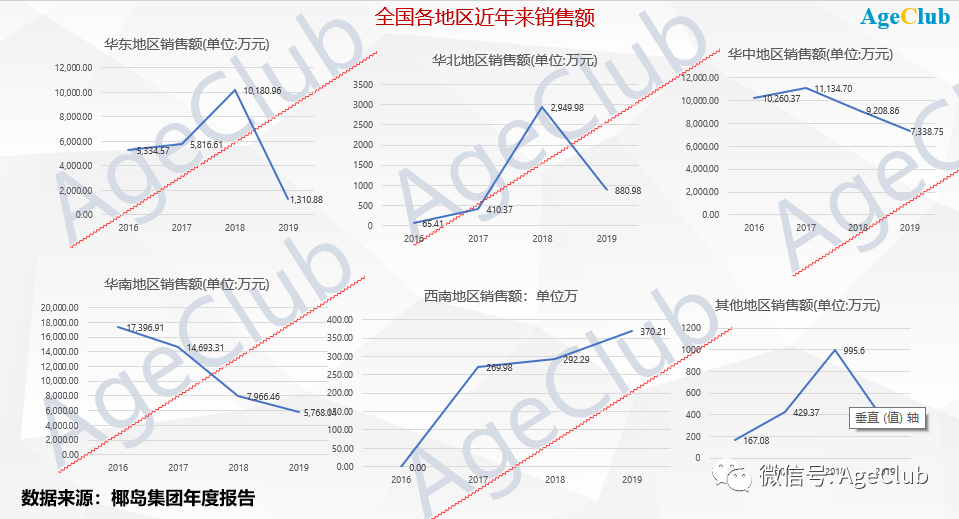 虽然进行了线下销售渠道的调整,同时加强与经销商的合作,但是椰岛的销售额反而出现断崖式下跌。比如华东地区从2018年的10180万元下降到2019年的1310万元;华北地区从2018年的2949万元下降到2019年的880万元。