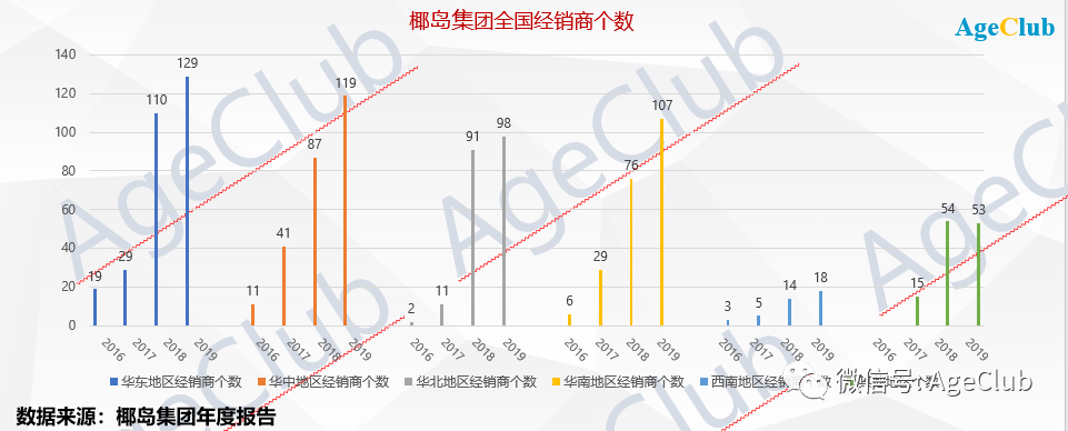 除此之外,椰岛集团有限公司大力发展自己的经销商团队。从年报显示的信息来看,椰岛集团在华东、华中、华北、华南地区新增的经销商最多,西南和其他地区的经销商数量较少。