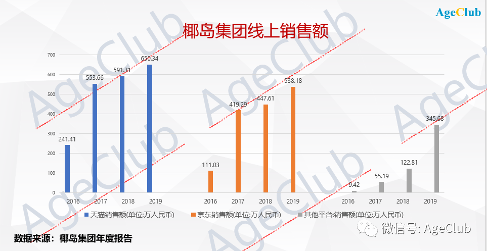 面对线下销售的困境,椰岛集团在2015年开始开拓线上销售渠道,涉足天猫商城、京东商城、苏宁易购、飞牛网、一号店等电商平台,同时授权第三方电商专营团队开展电商营销。