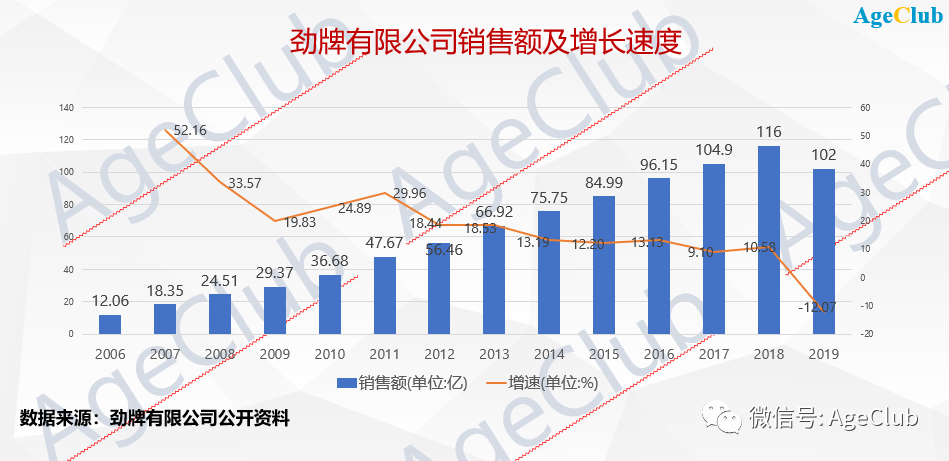 通过公开信息整理劲牌的历年销售业绩,自2006年以来销售额就一直保持高速增长,2018年达到最高值116亿元,是2006年的9.6倍。