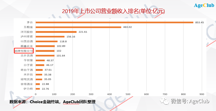 AgeClub将14家白酒上市公司的年营收与劲牌进行对比。仅有7家公司的营业额在2019年超过100亿元。