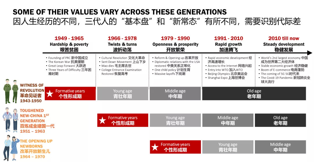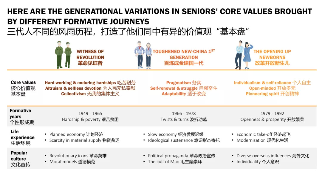 了解是服务的基础。为了深入洞察银发群体,蔚迈根据出生与成长的时代背景,将银发群体划分为“革命见证者”“建国一代”与“改革开放新生儿”三个子群体,并采用科学严谨的人类学文化背景方法,通过回顾三个年龄段老人的生命历程,追溯时代和社会文化变迁对其财富与消费观的影响。
