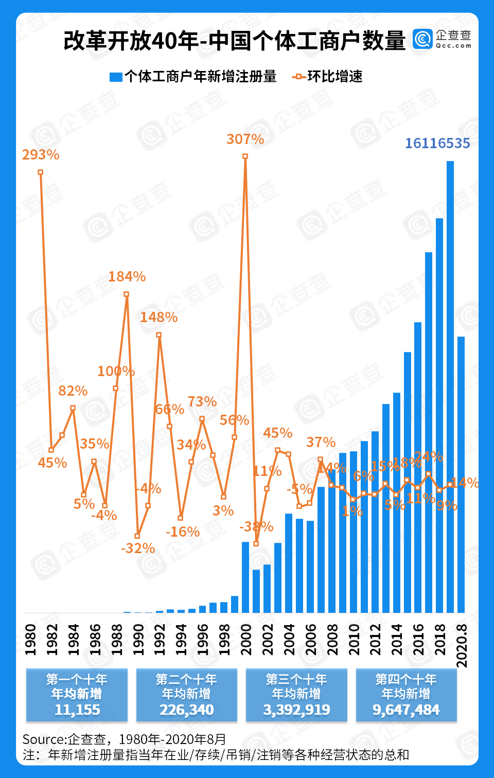 企查查数据显示,1980-1989年,我国个体户年均新增不过1万多家;1990-1999年,我国个体户年均新增超20万家;到第三个十年,个体户年均新增量已有百万规模,达到近400万家;第四个十年,年均新增965万家,千万大关已近在眼前。