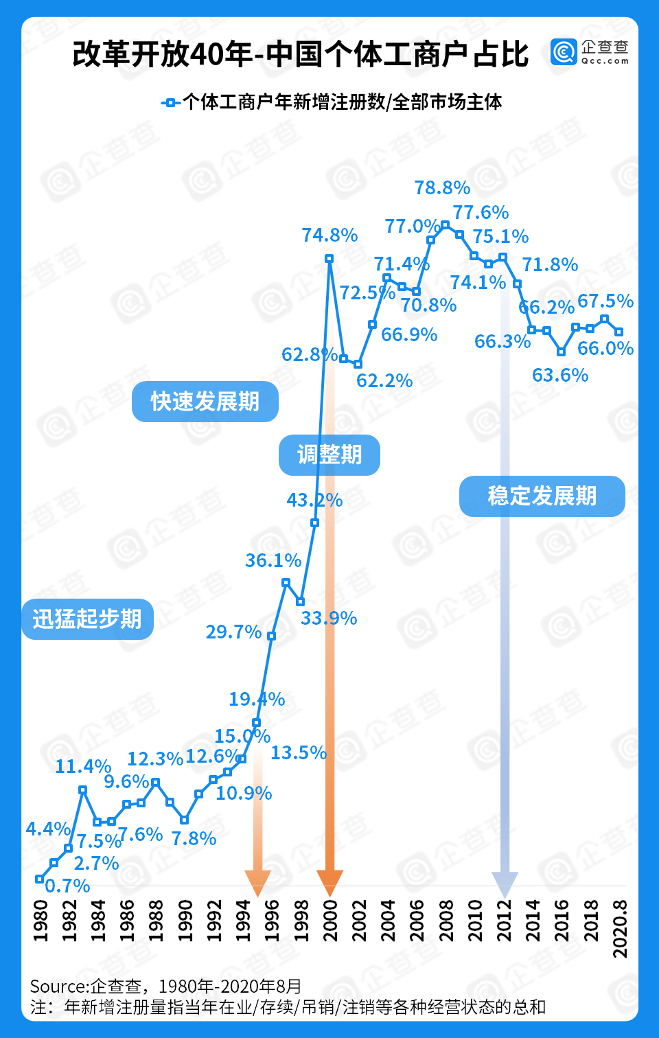 企查查数据显示,2020年我国个体工商户的注册量占全部市场主体的66.0%,并曾在2008年达到78.8%的历史最高比例,也就是说,彼时10个市场主体的注册中就有7-8个是个体户。纵观40多年来的历史来看,1995-2000年是个体工商户比例增加最快的时段,仅仅5年时间,便从19.4%增加到74.8%。2000年经历了“死户清理”后,比重稍有下降,但随后几年再次“起飞”,基本保持在60%-80%,这也是属于个体工商户的高光十年(2002-2012年)。从2012年起,个体工商户占比开始有所降低,从7字头重回6字头。