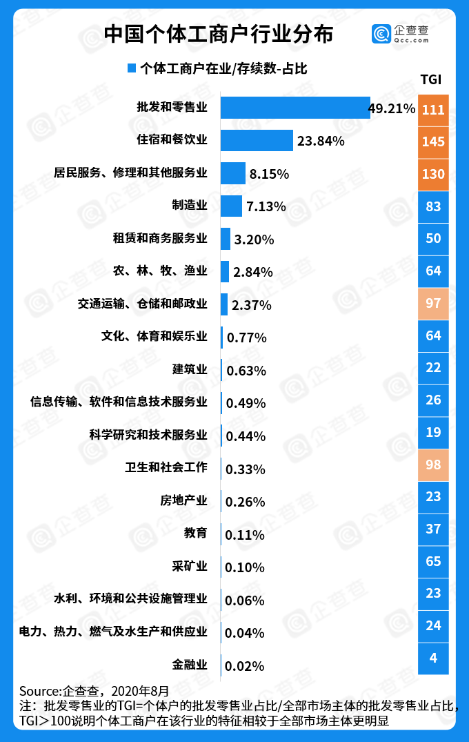 不难发现,个体户数量分布最多的行业都与居民生活服务相关,由于个体工商户规模较小、经营灵活、适应面广,他们天然与服务业的需求十分匹配。企查查数据显示,“批发零售业”、“住宿餐饮业”以及“居民服务、修理和其他服务业”是个体工商户分布最多的行业,并且这三大行业的TGI远远大于100,表明其个体户相较于其他行业更为活跃。