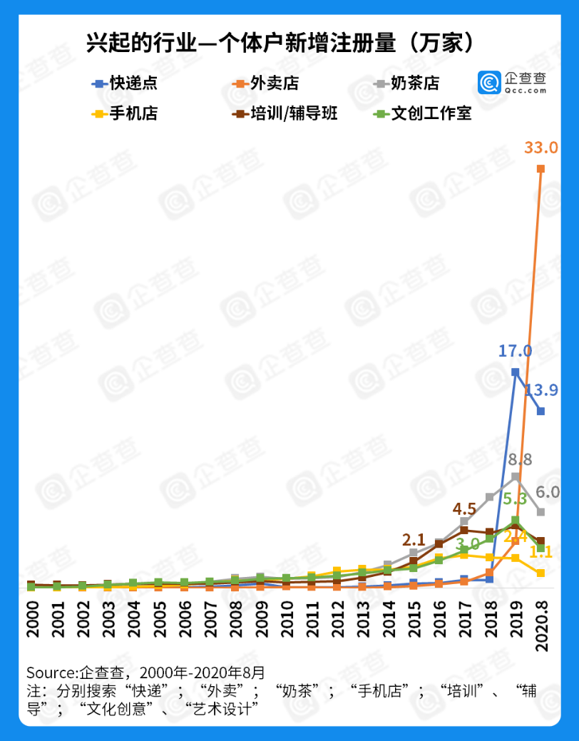 企查查数据显示,过去20年间,快递相关个体户年注册量已从最初的162家发展到如今的十万多家,奶茶相关个体户从514家发展到6万多家,手机店则是从178家上升1万多家,培训/辅导班相关个体户如今年增量已达4万多家,此外文创工作室相关个体户数量也从年新增696家到5万多家。