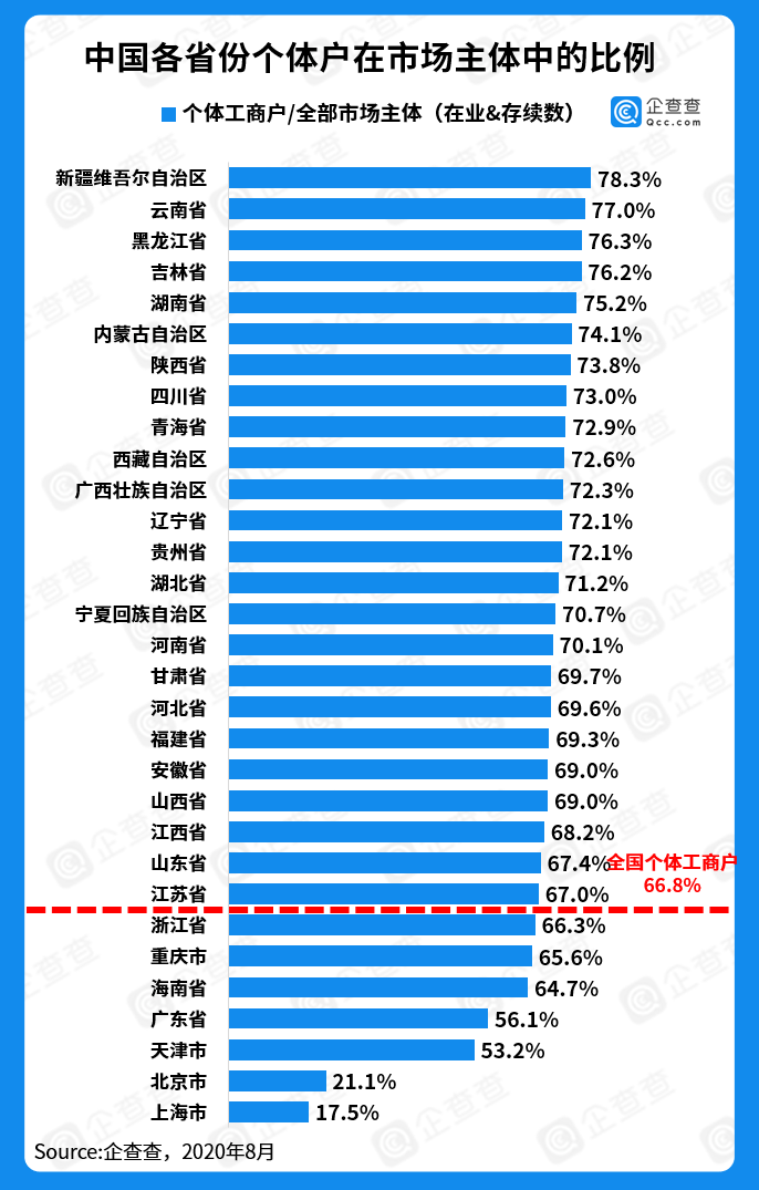 另一方面,个体户数量的绝对值不能与个体户的活跃度划等号。以广东省为例,虽然个体户数量排名第一,但其TGI小于100,说明广东的个体户并不十分活跃。个体工商户占比数据更为直接的验证了这一点,企查查数据显示,截至2020年8月,广东省个体户占比56.1%,而全国个体户占比66.8%,广东省个体户占比低于全国水平,也即广东省的其他市场主体(国企、外企、民企等)更为活跃。