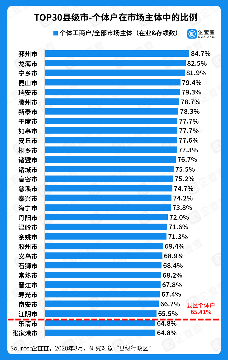 从个体户在市场主体中的比例来看,企查查数据显示,TOP30县区的个体户比例基本在65%以上,而全国所有县区中个体户的占比达65.41%,TOP30县区中只有2个县区低于这个数字。个别县区,例如邳州市、龙海市、宁乡市,它们的个体户占市场主体的比例高达80%以上。综上所述,个体经济确如燎原之火在县域经济中熊熊燃烧。