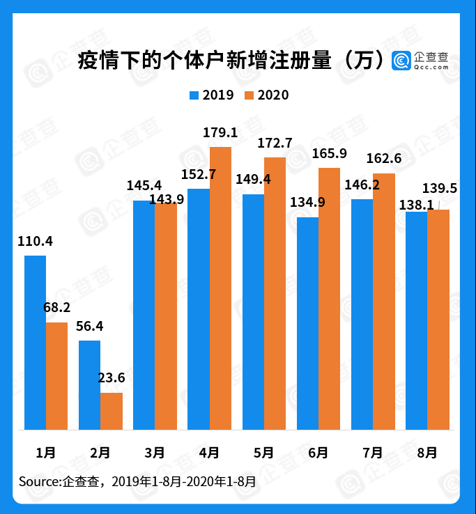 企查查数据显示,2020年1-2月,受疫情影响,我国个体工商户新增注册量明显低于去年同期,尤其是疫情最严重的2月,个体户新增注册量少于去年的一半。3月份,注册量迅速回升至去年同期水平,并在4-8月均实现反超。从1-8月的总量来看,去年我国个体户新增注册量1033.4万家,而今年达到了1055.5万家,略高于去年。