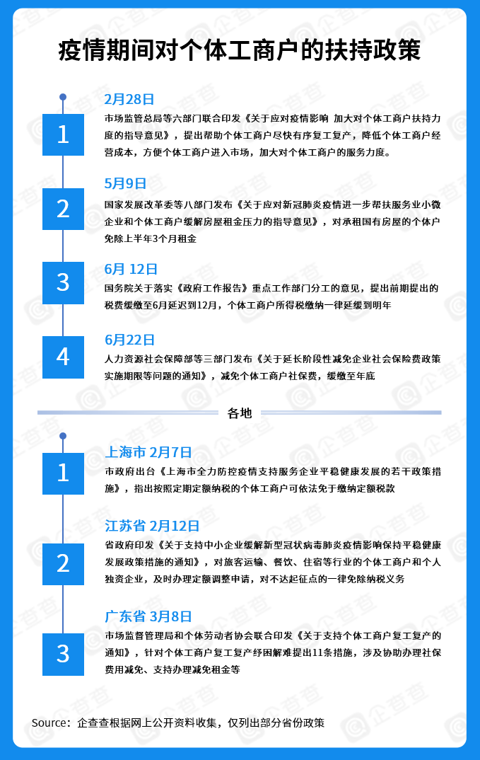 2月28日,疫情集中爆发期,国家为正确引导个体户复工复产,印发《指导意见》,为个体户在税费、社保、房租等各方面提供优惠扶持。随着抗疫战线的拉长,各种优惠政策的截止日期亦从6月份延期到12月份,体现了国家对个体户的极大关注。