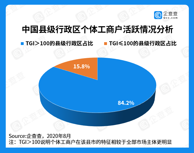 最后,我们对2847个县级行政区进行特征倾向度筛选,发现TGI大于100的县级行政区占比高达84.2%,有超8成县级地区的个体户比其他市场主体更加活跃,这充分证实了我国县域经济的活力源自个体工商户。