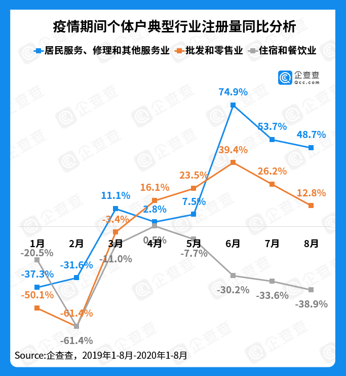 “批发零售业”紧随其后,在4月份恢复元气,同比增长率由负变正,亦在6月攀至顶峰,其后逐渐回落。其中口罩批发/零售相关个体户今年1-8月注册量新增1.98万家,而去年同期注册量不过562家。汽车零配件批发/零售相关个体户今年1-8月注册量新增8.9万家,而去年同期注册量3.7万家。
