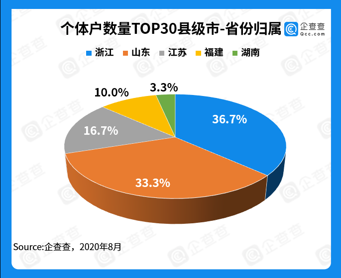 企查查还发现,这些个体经济发达的县级区域大多分布于浙江、山东和江苏,以及福建和湖南,这与省份排名亦有所对应,如同剥丝抽茧一般,个体经济在哪些地方活跃的真相逐渐显露出来。浙江省个体经济十分发达,所辖县区在TOP30县区中既排名靠前,又数量最多;山东省所辖县区排名虽不靠前,但胜在数量多;江苏省以昆山为首,数量虽不敌浙江、山东,但稳居榜首,此三省个体经济最为强势。至于福建和湖南,也有南安市、宁乡市、石狮市、龙海市这些个体经济发达的县区。