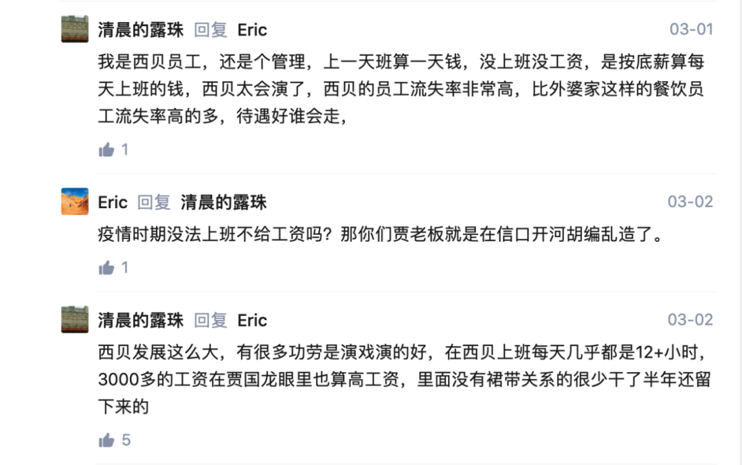 有一位自称是西贝员工的网友表示,疫情期间,他们是“上一半班算一天的钱,没上班没工资”,这种说法似乎和贾国龙每月需拿出1.5亿去发工资的说法相悖。当然,这则消息未经证实。