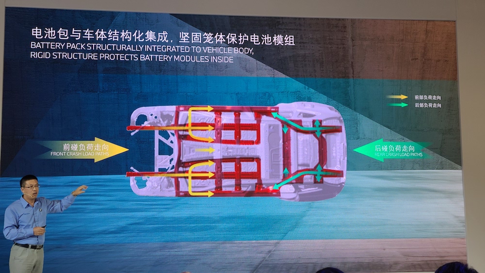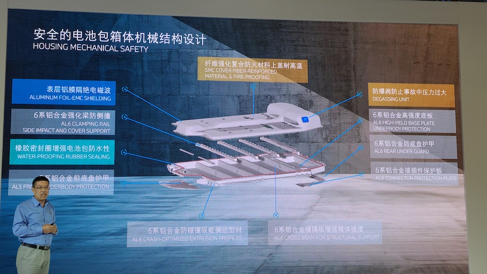 电池包采用液体温控设计,电池模组上多个温度传感器时刻监控电池包温度。电芯的方型铝制壳体本身具有抗压性,顶部有泄气泄压阀,在单个电芯热失控的情况下降低对模组和电池包的整体影响。