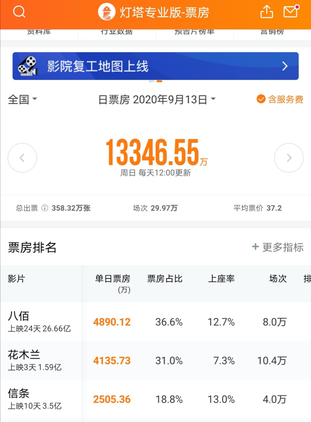 宣传了大半年的《花木兰》9月11日正式在中国公映,首个周末票房1.59亿,上映第三天上座率仅为7.3%,单日票房甚至被已经上映了大半个月的《八佰》反超。