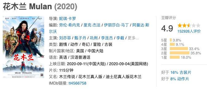 截至9月14日,电影《花木兰》在猫眼、淘票票的评分均为不甚理想的7.6,豆瓣15万人打出了4.9的超低分,对于好莱坞大片来说极其罕见。