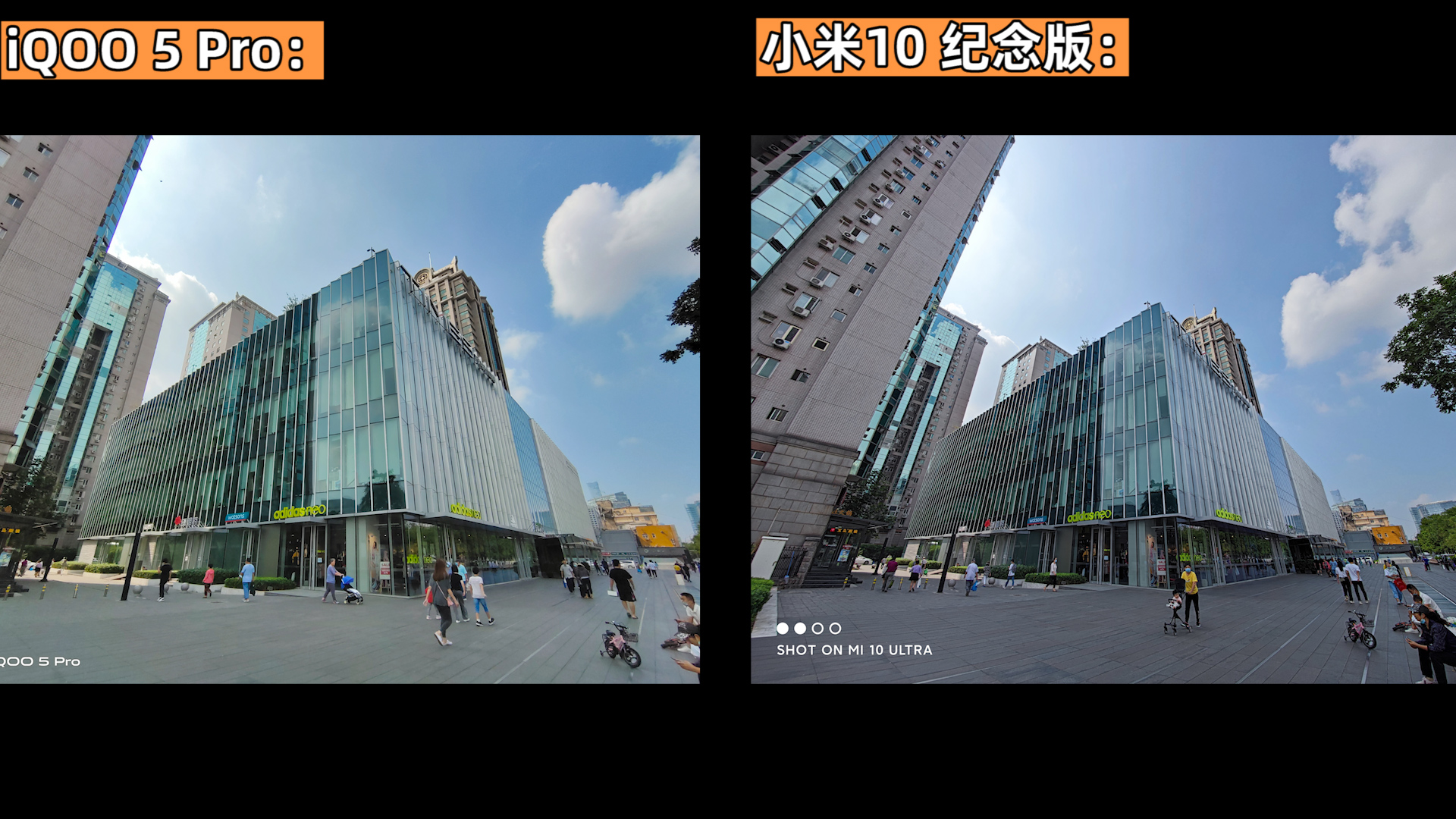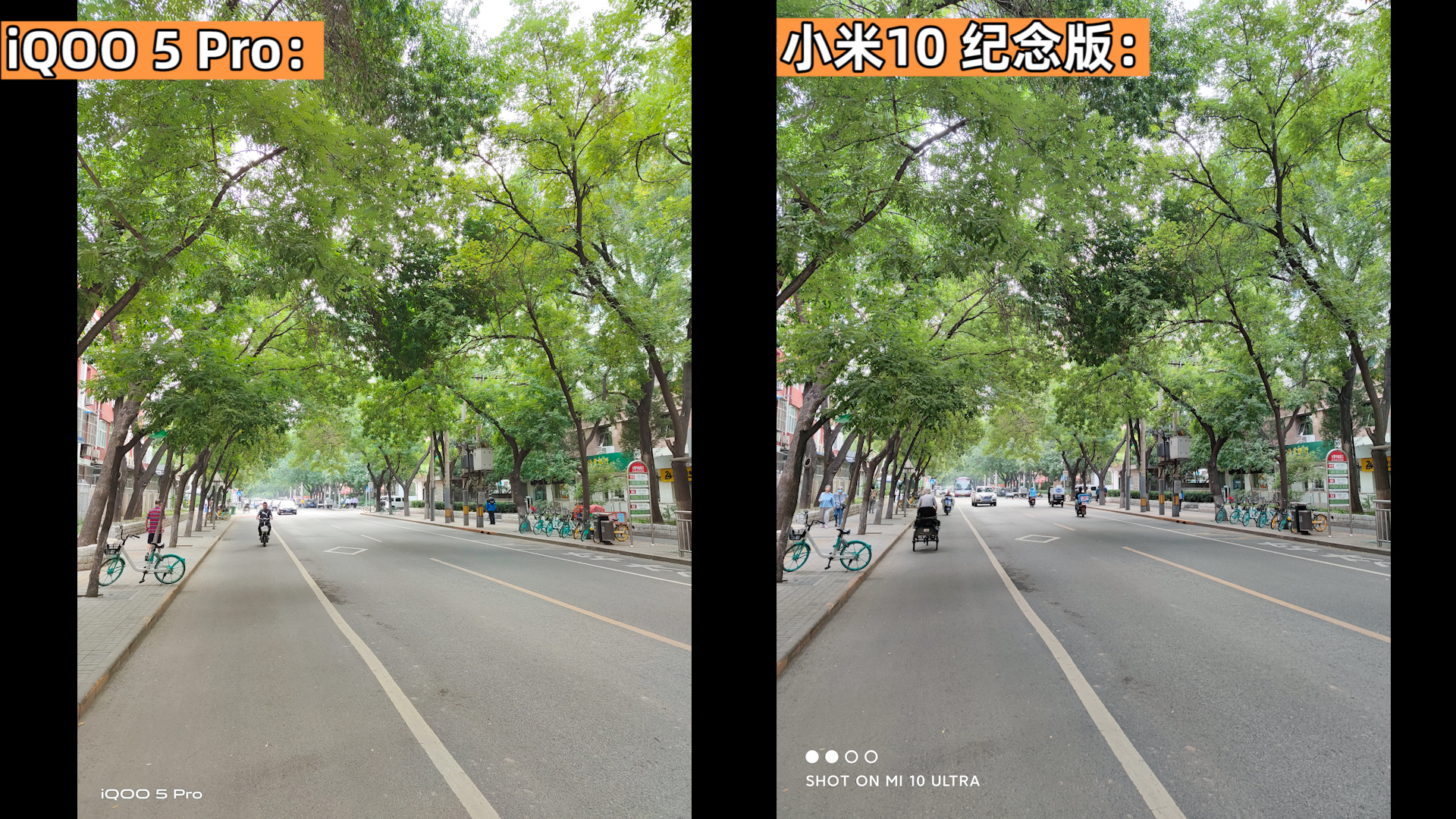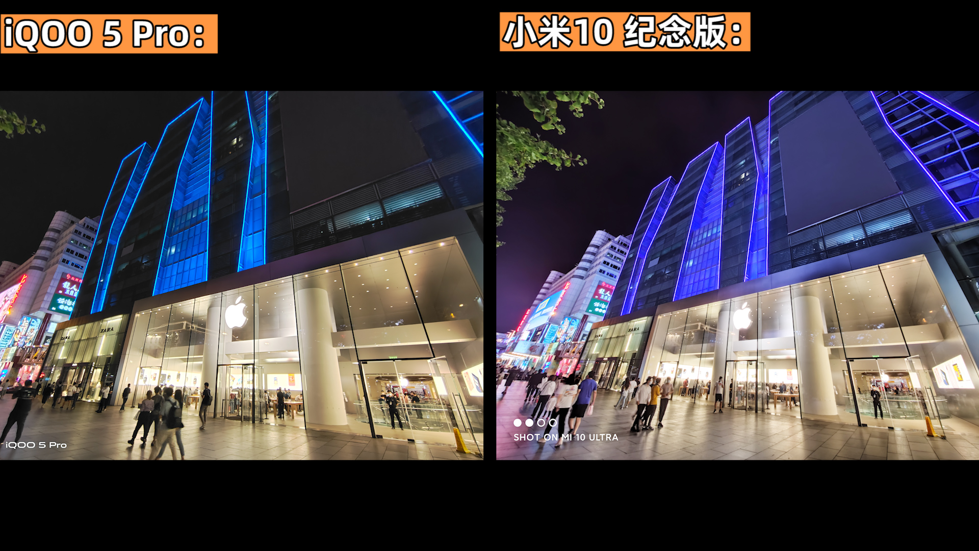 小米10纪念版的广角更广,整体色调也更蓝,而在夜景表现上,iQOO 5 Pro更倾向于明暗对比,小米10纪念版则偏向于整体画面的提亮。