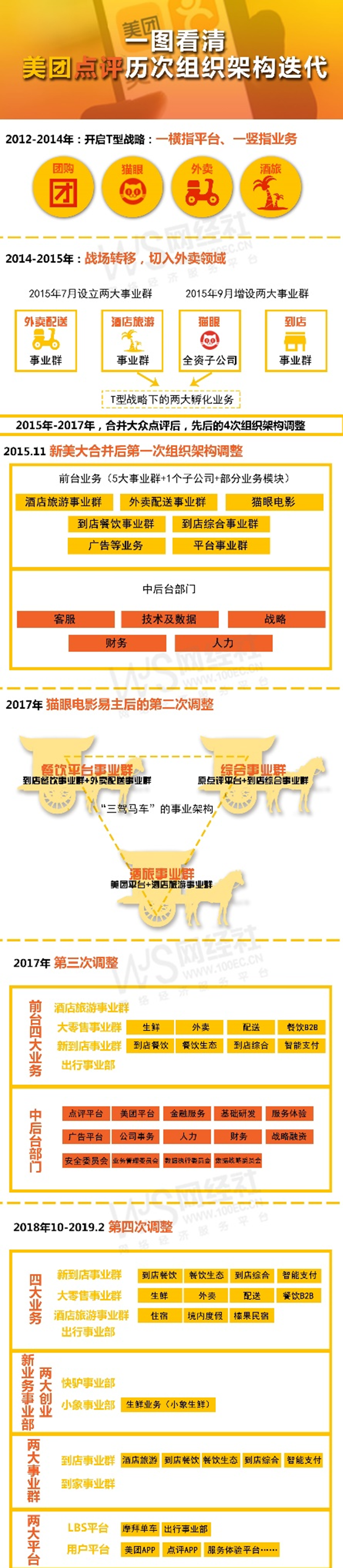 在合并之后的第二次调整中,随着美团确立“三架马车”的事业构架,大众点评被进一步打散;在2017年的架构调整中,大众点评被纳入“新到店事业群”;在 2018架构调整中,大众点评作为美团点评的两大用户平台之一,由美团联合创始人王慧文统领。