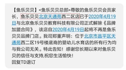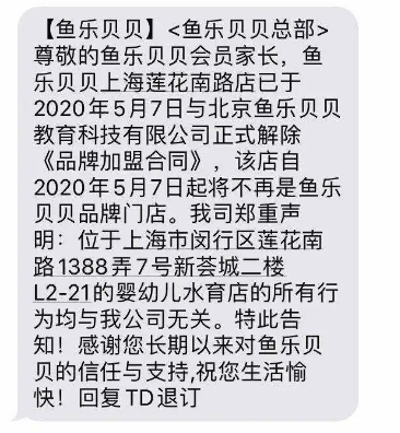 上海位于莲花南路鱼乐贝贝店跑路事件,鱼乐贝贝总部发短信向家长回应”已解除加盟合同,该门店自2020年5月7日起将不再是鱼乐贝贝品牌门店,并表示该门店所有行为均与我公司无关”,同样的声明也发生在北京鱼乐贝贝天通苑西二区店。