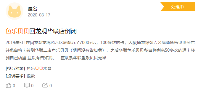 在黑猫投诉平台,去年,一家长给孩子在北京回龙观的“龙锦苑”鱼乐贝贝门店办了一张7000多元的会员通卡,一共100余次数。疫情期间,鱼乐贝贝一直处于关店中,家长后来才知道,“龙锦苑”的鱼乐贝贝早已私自将卡中剩余的50余次数转到华联二店鱼乐贝贝,在转卡期间,门店并未通知家长转店消息。另外,家长转卡的门店一直未营业。在此前,官方客服曾承诺,回龙观华联的鱼乐贝贝店将于7月1日开业。
