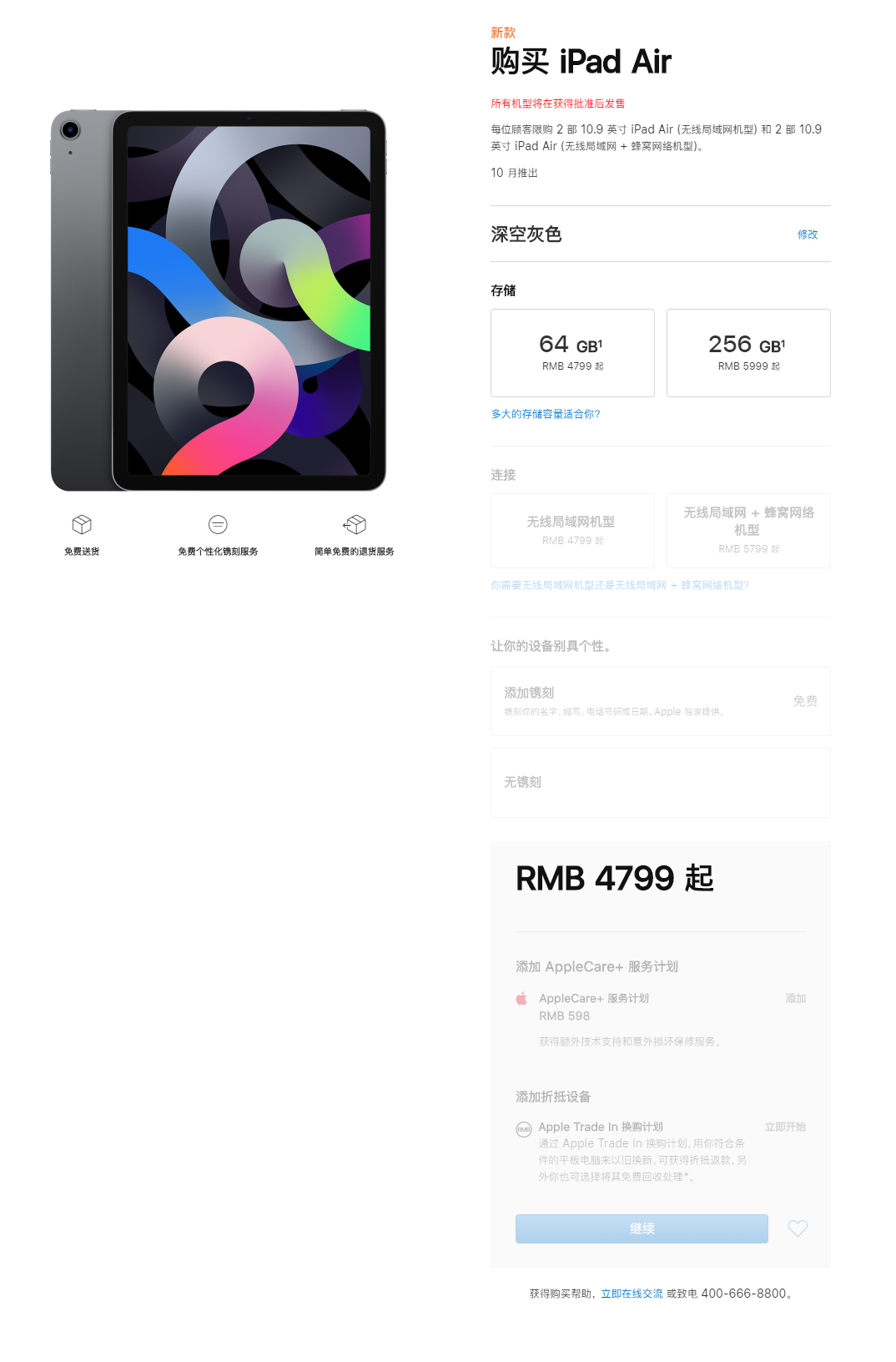 苹果中国官网显示,国行版iPad Air 起售价4799元,有64G和128G两种存储版本;新版iPad起售价2499元;Apple Watch SE起售价2199元,Apple Watch Series 6起售价3199元。
