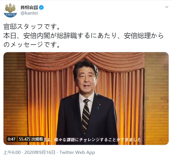 路透社9月16日消息,日本首相安倍晋三今天通过日本首相官邸推特发布了一条时长近1分钟的视频,在视频中回顾了执政以来的种种经典画面,并表示“感谢各位一直以来的支持”。