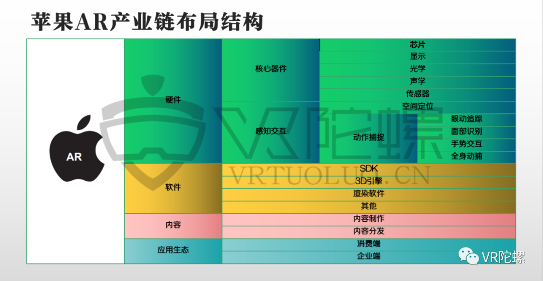 大家好,我是VR陀螺的主编案山子。苹果会有什么产品出来是大家关心的话题。从苹果现有的产业链布局来看,可以看到苹果从硬件、软件、内容、应用生态等各个层面都有它的布局。