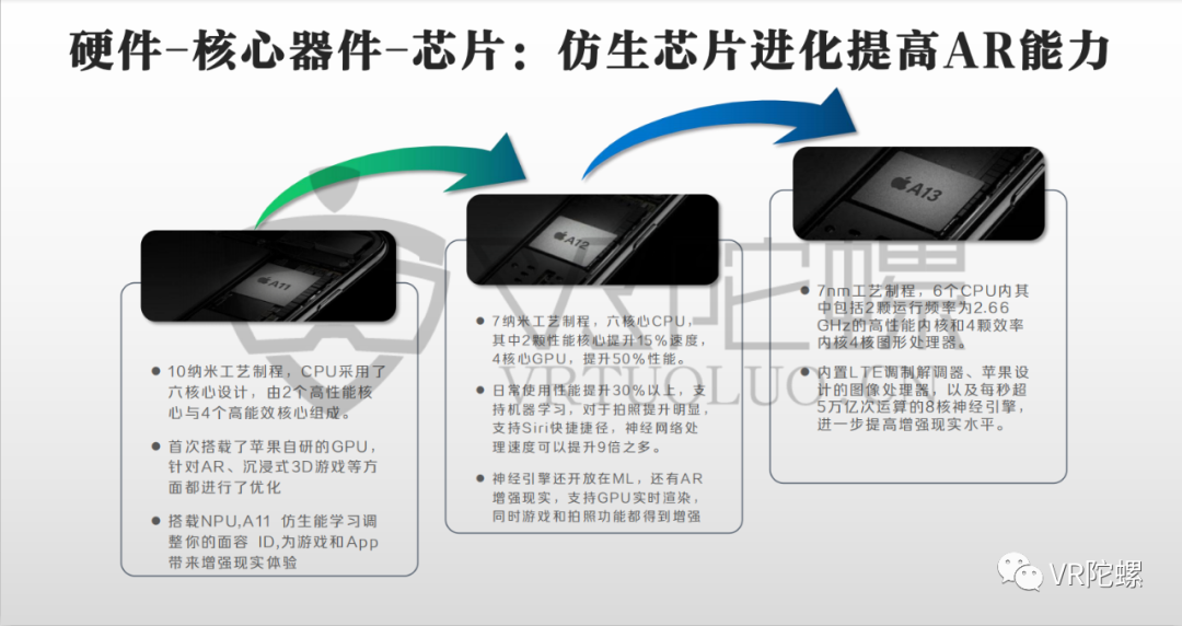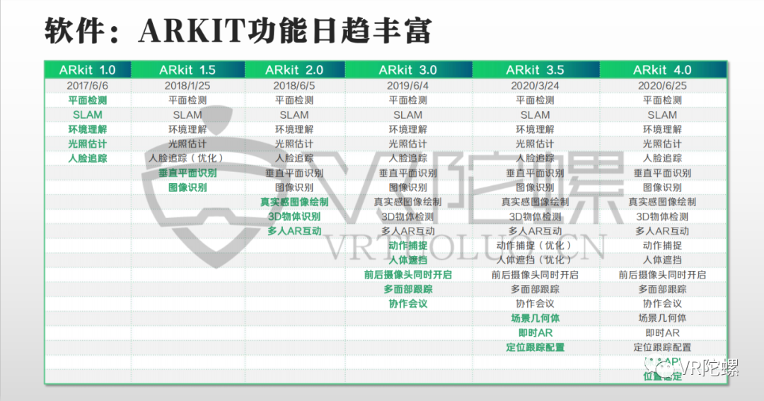 从硬件上来看,苹果在核心器件上主要推仿生芯片,今年是A11仿生芯片,并且首次在手机端实现了ARKit功能。ARKit最早只能实现平面识别,环境和空间感知没那么强,后来平面、侧面识别和肢体手势结合,可以实现人体骨骼动作,虽然没有光学动捕那么深度,但现在已经能够做到基础交互了。