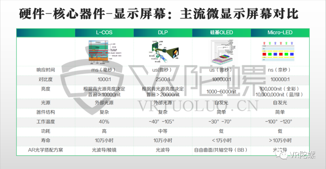 关于显示屏。苹果目前储备Micro-LED技术,其中有潜力的是全息波导光学方案,而且收购的大部分是Micro-LED的企业。但技术难题是Micro-LED还没有量产出来,全息眼镜基本没有量产的产品。说到屏幕的基本参数,从L-COS、DLP、硅基OLE,到Micro-LE,差异挺大的,可以看出Micro-LED优势明显,亮度上能达到100,000nit(全彩) 10,000,000nit(蓝/绿)的量级。