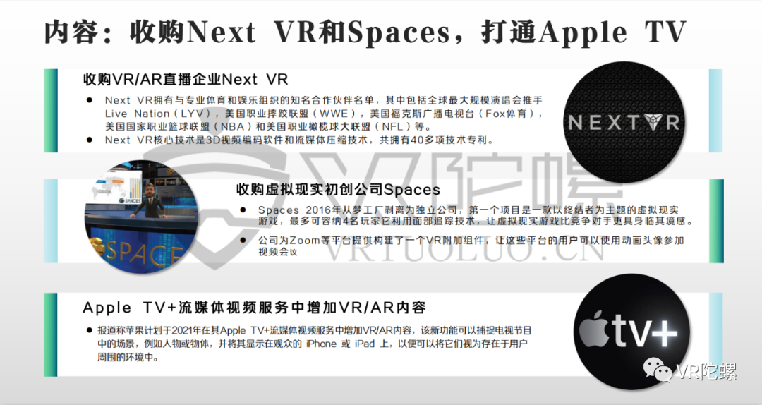 苹果底层的链条布置完善,这两年开始有内容生态上的动作。收购VR/AR直播企业Next VR、收购虚拟现实初创公司Spaces、Apple TV+流媒体视频服务中增加VR/AR内容,在我们看来也是内容生态上重要的一步。