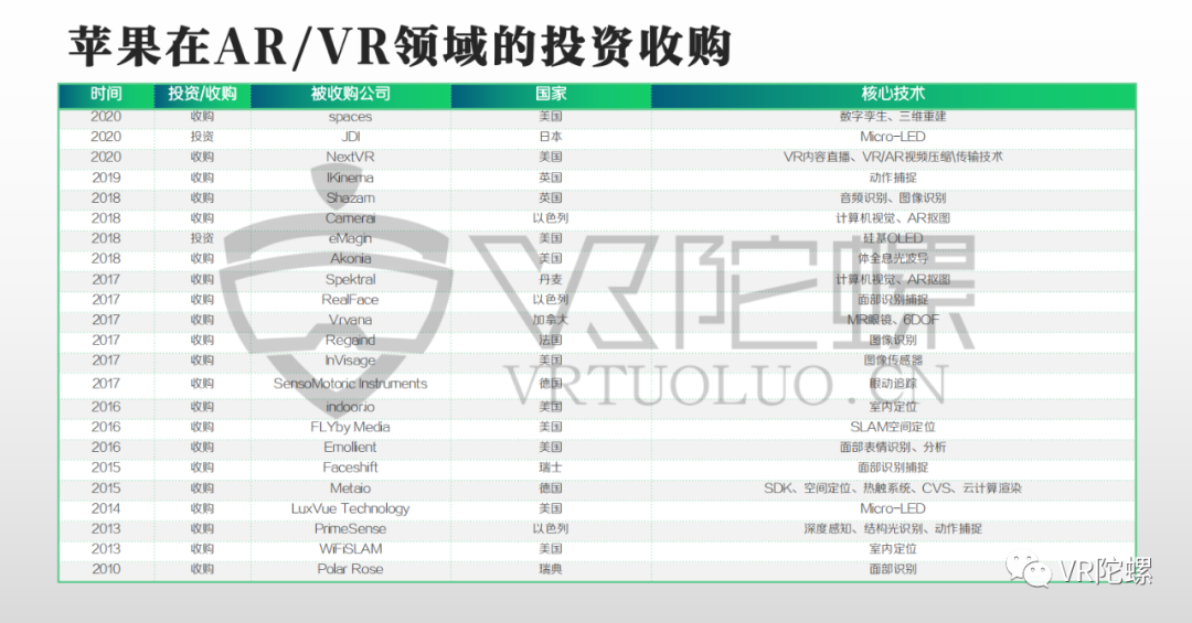 通过对苹果在AR/VR领域的投资收购的整体分析,直观上可以看到其实收购的并不多,大部分以收购形式进行都是底层公司。早些时候,从硬件底层来布局,比如2010收购面部识别硬件技术公司Polar Rose;到了近期,包括苹果前阵子收购的NextVR等公司,是属于内容端,收购的方向偏表层而且收购时间相对来说比较晚。