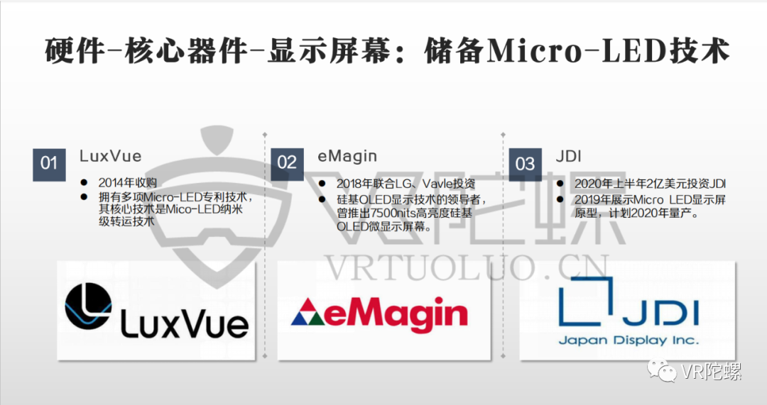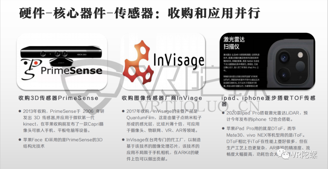 在传感器方面,苹果于2013年收购了3D传感器Prime Sense。3D传感器用在人体动作捕捉、近距离的环境识别中,苹果的Animoji也是用到这个技术。收购图像传感器厂商InViage,是Ar/Vr布局的一环。今年的苹果发布会上,苹果ipad pro有搭载 iphone逐步搭载TOF传感器,不仅是简单的环境识别,而是有深度的识别,能够与虚拟物体进行交互,这对于实现混合现实很有利。