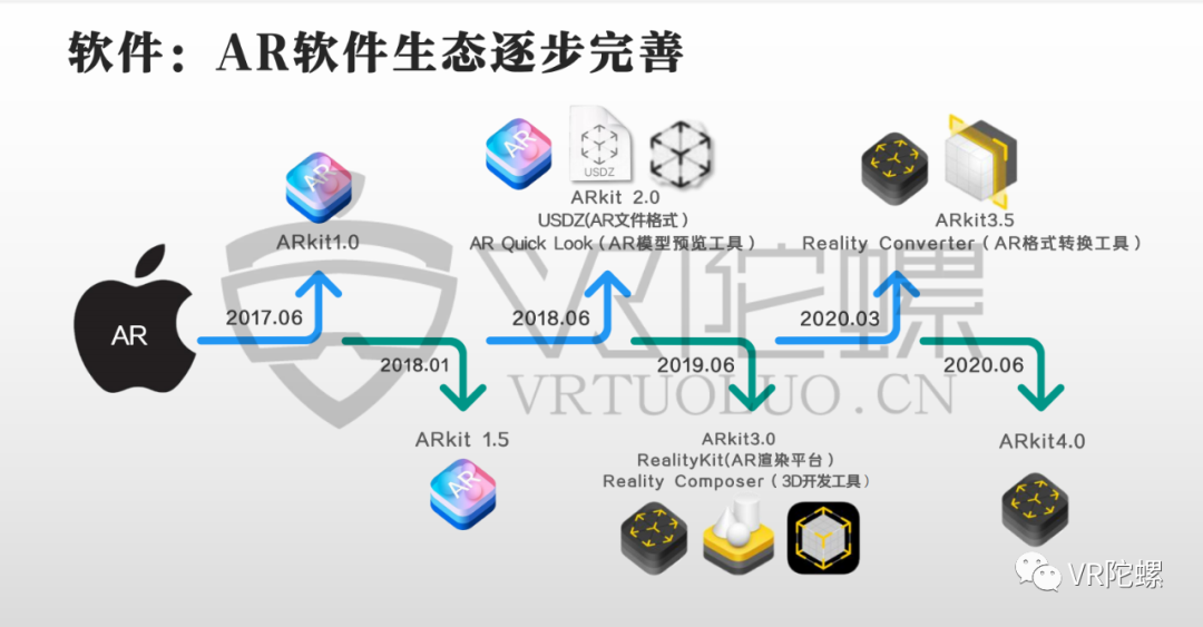 2017-2020年,ARKit软件在三年内的升级迭代,总体上保持着一年一个迭代的节奏。值得注意的是,在2017年时候推出SDK,18年就推出了.usdz文件格式和AR Quick Look模型预览工具。我们认为,.usdz是在AR时代定义AR文件格式的重要标志,像我们现在安卓app是.apk,ios是.ipa。