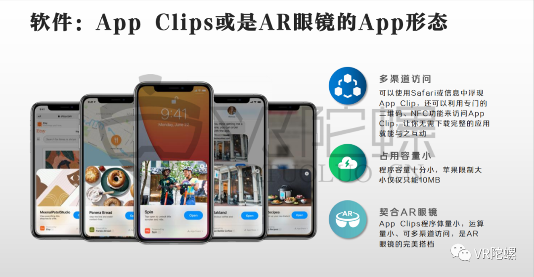 苹果AR软件技术生态,说明苹果的AR生产闭环已经形成了。App Clips或是AR眼镜的app形态。像我们现在的东西是越来越轻的,未来到云端已是个趋势,只是现在的5G或者5G手机还未普及。用这个技术的话让你无需下载完整的应用就能与之互动,程序容量十分小。而App Clips程序体量小,如果功耗很大的话对设备是一个负担,运算量小、可多渠道访问的App Clips,是AR眼镜的完美搭档。