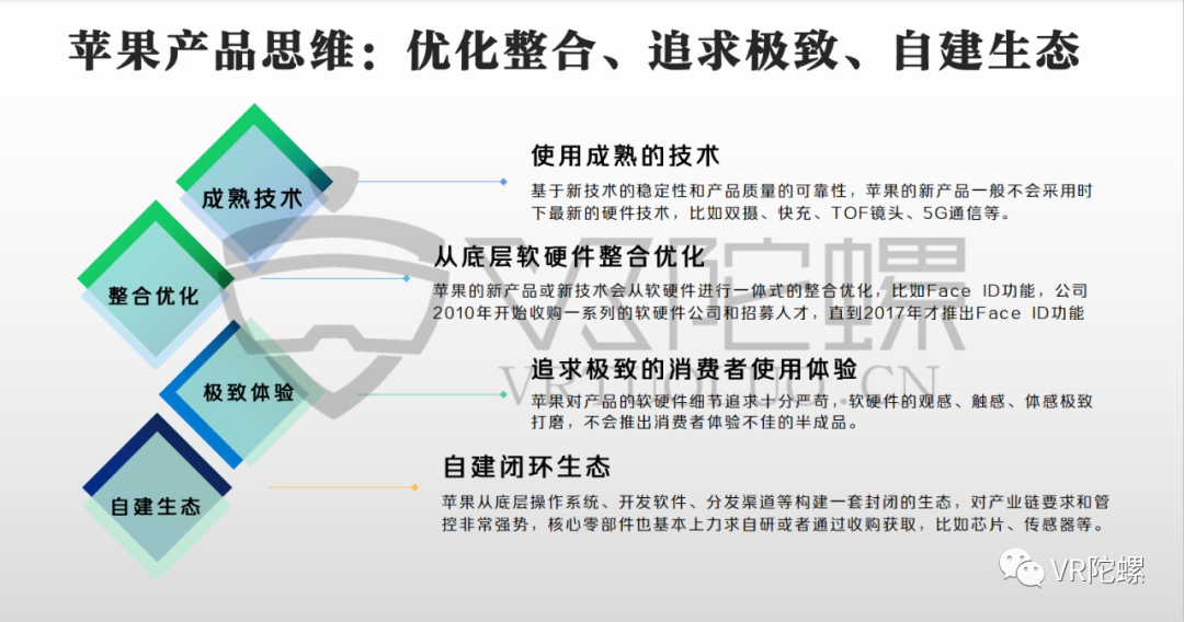 基于对苹果AR产业链布局结构、在AR/VR领域的投资收购、硬件的核心器件和感知交互、软件生态、内容以及应用生态的深度剖析,案山子总结苹果产品思维具有“优化整合、追求极致、自建生态”的特点。